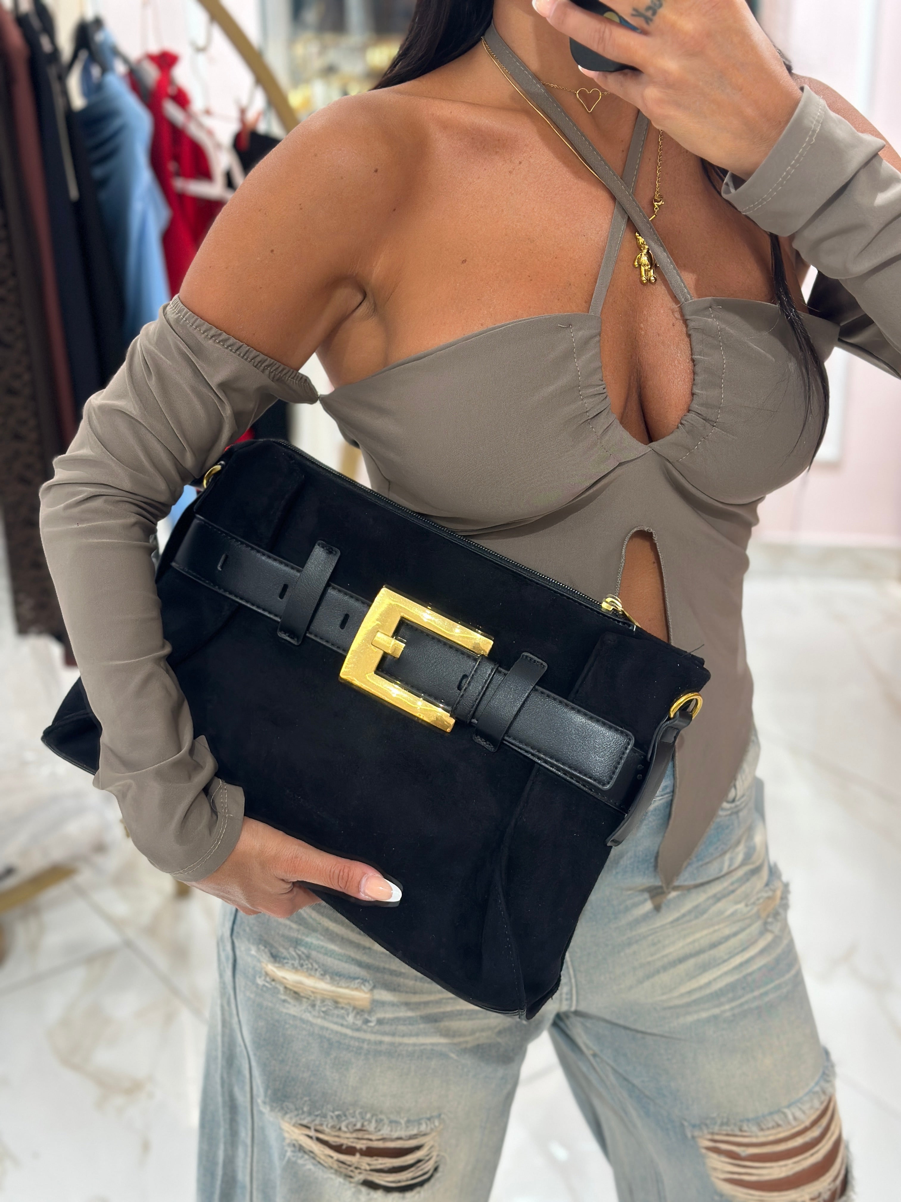Borsello in camoscio con fibbia oro, tracolla compresq