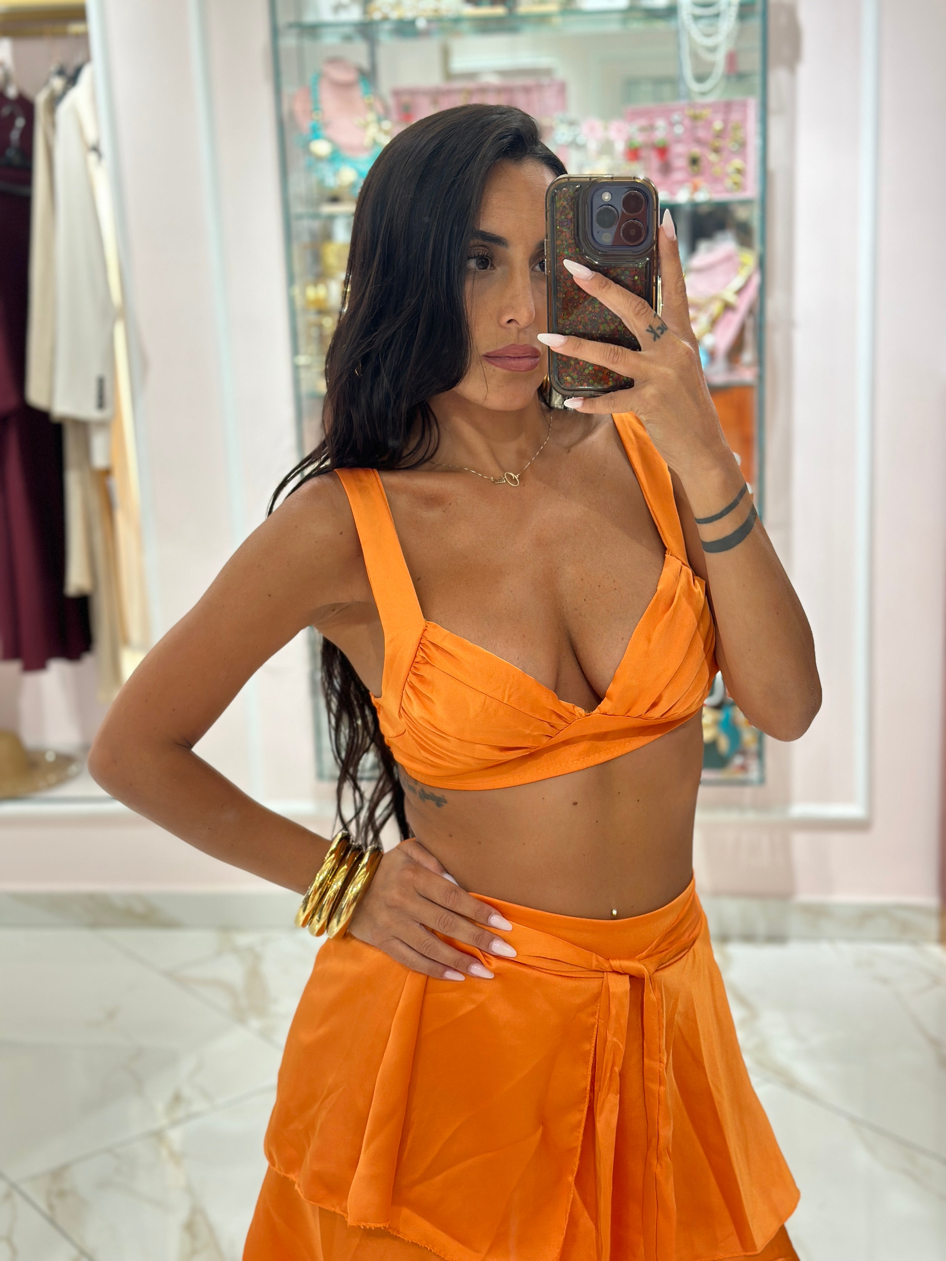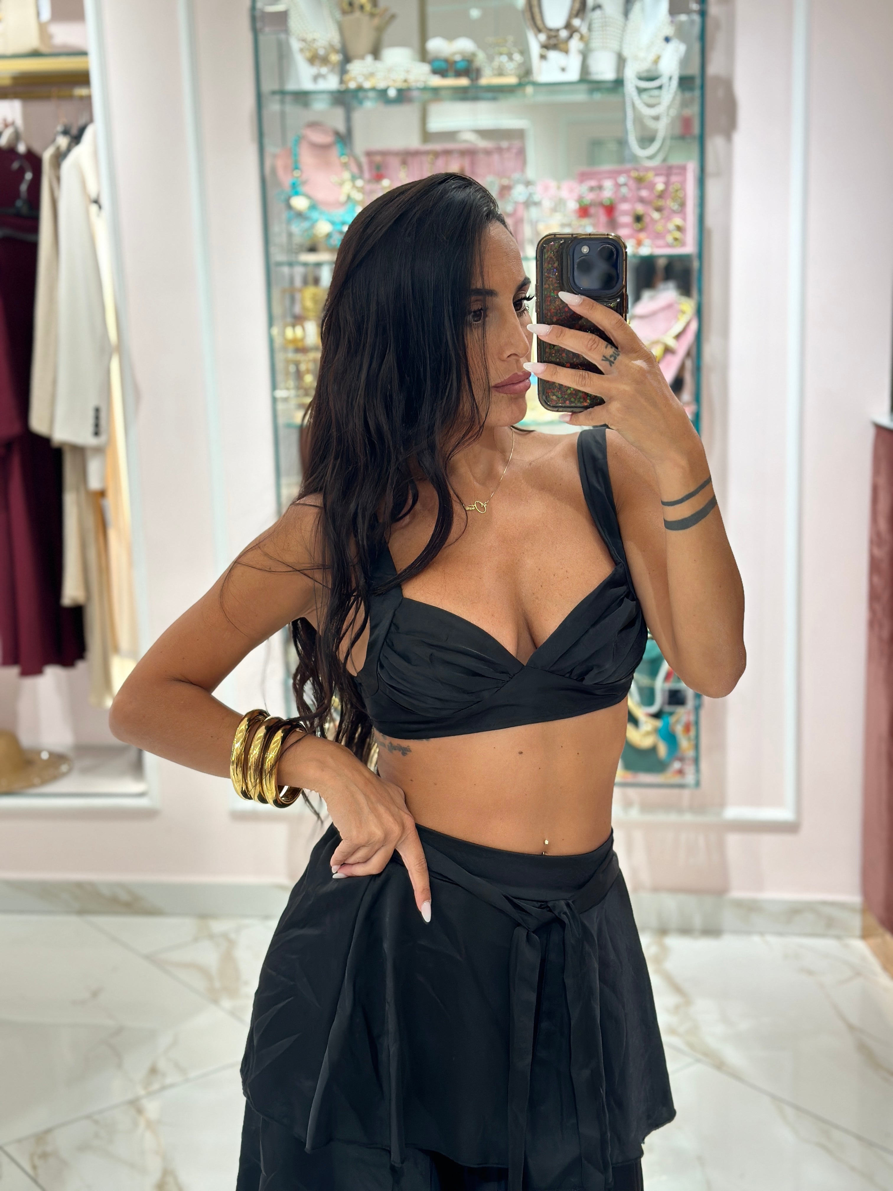 Coordinato top e pantalone con balze, tessuto raso, non elasticizzato